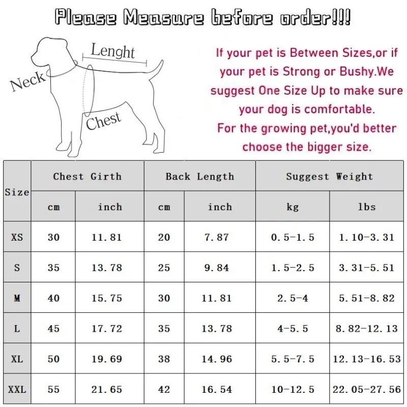 XXL: Chest 55cm/21.65” ; Length 42cm/16.54” ; Suggest Weight 10-12.5 kg/22.05-27.56 lbs.