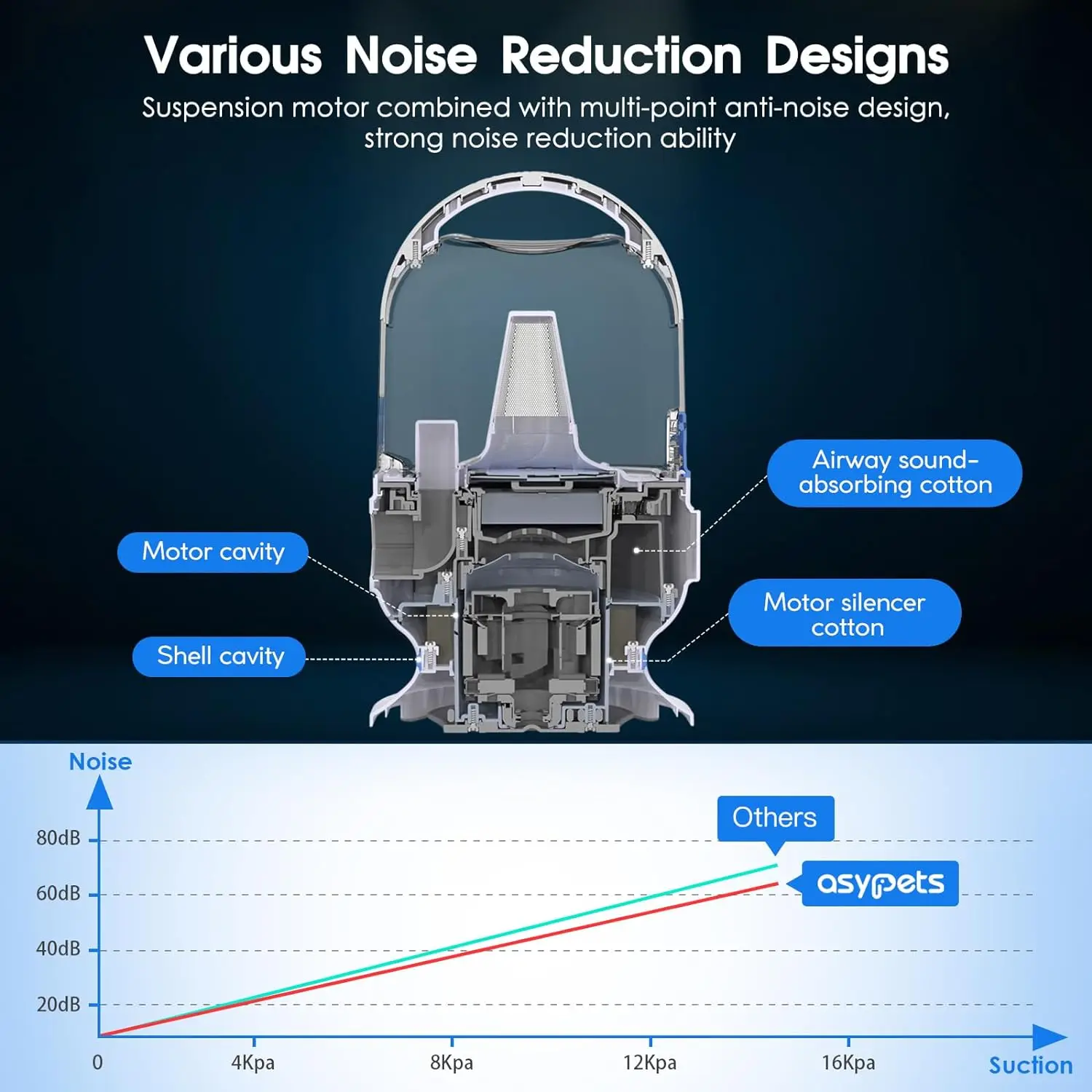 【Various Noise Reduction Designs】Suspension motor combined with multi-point anti-noise design, strong noise reduction ability,the motor inner cavity and the outer cavity casing are double-cavity to block noise, and the air duct and motor sound-absorbing cotton have doubled effect.