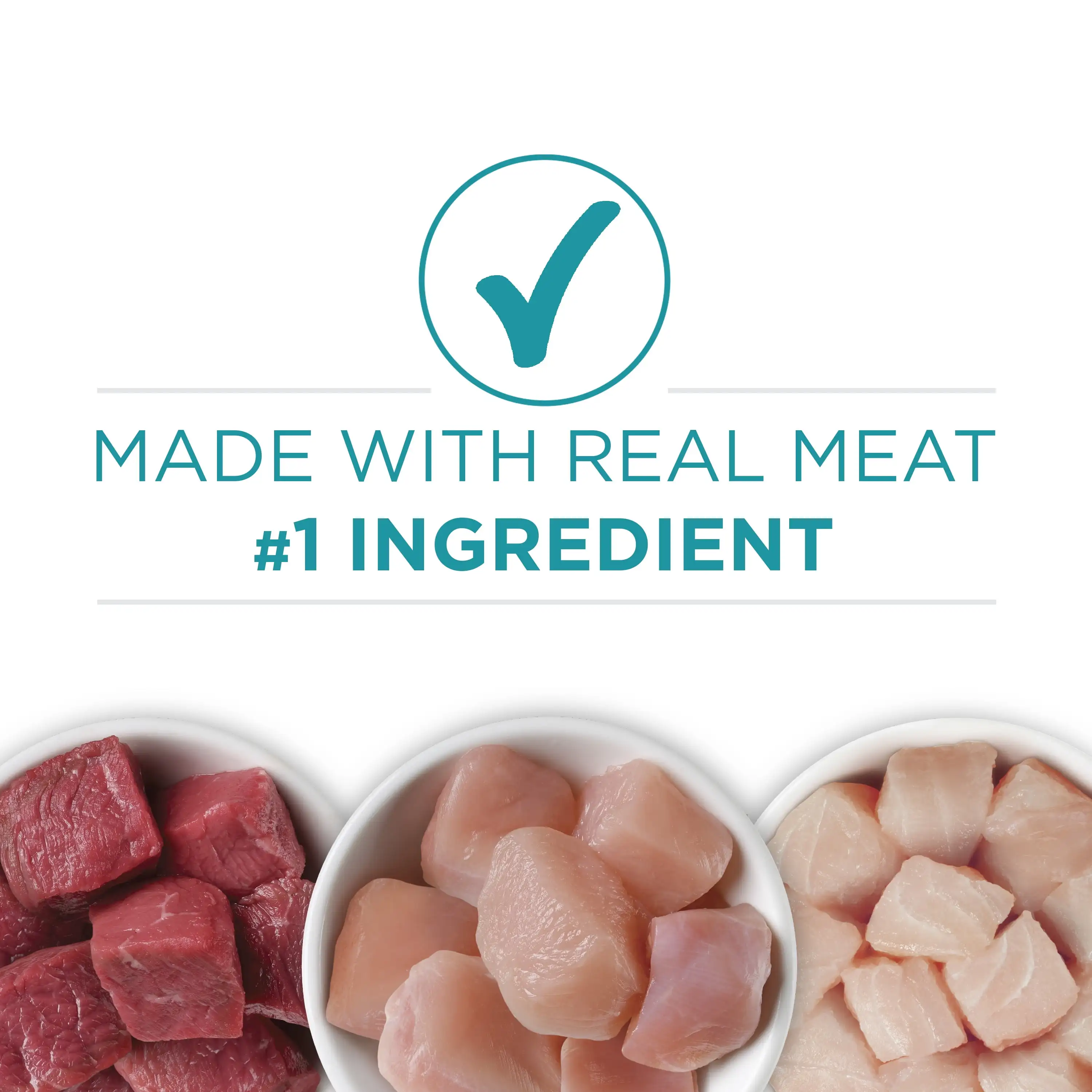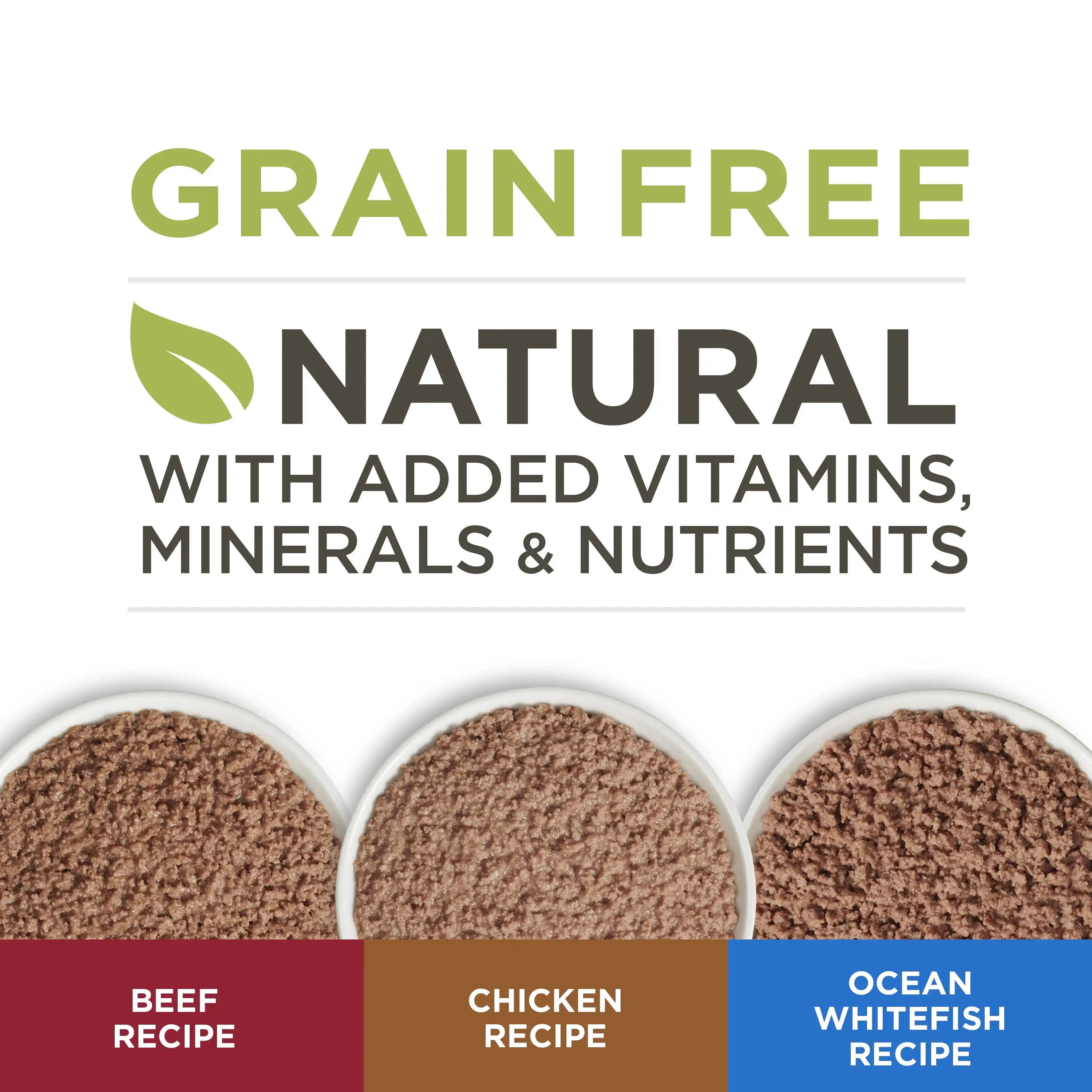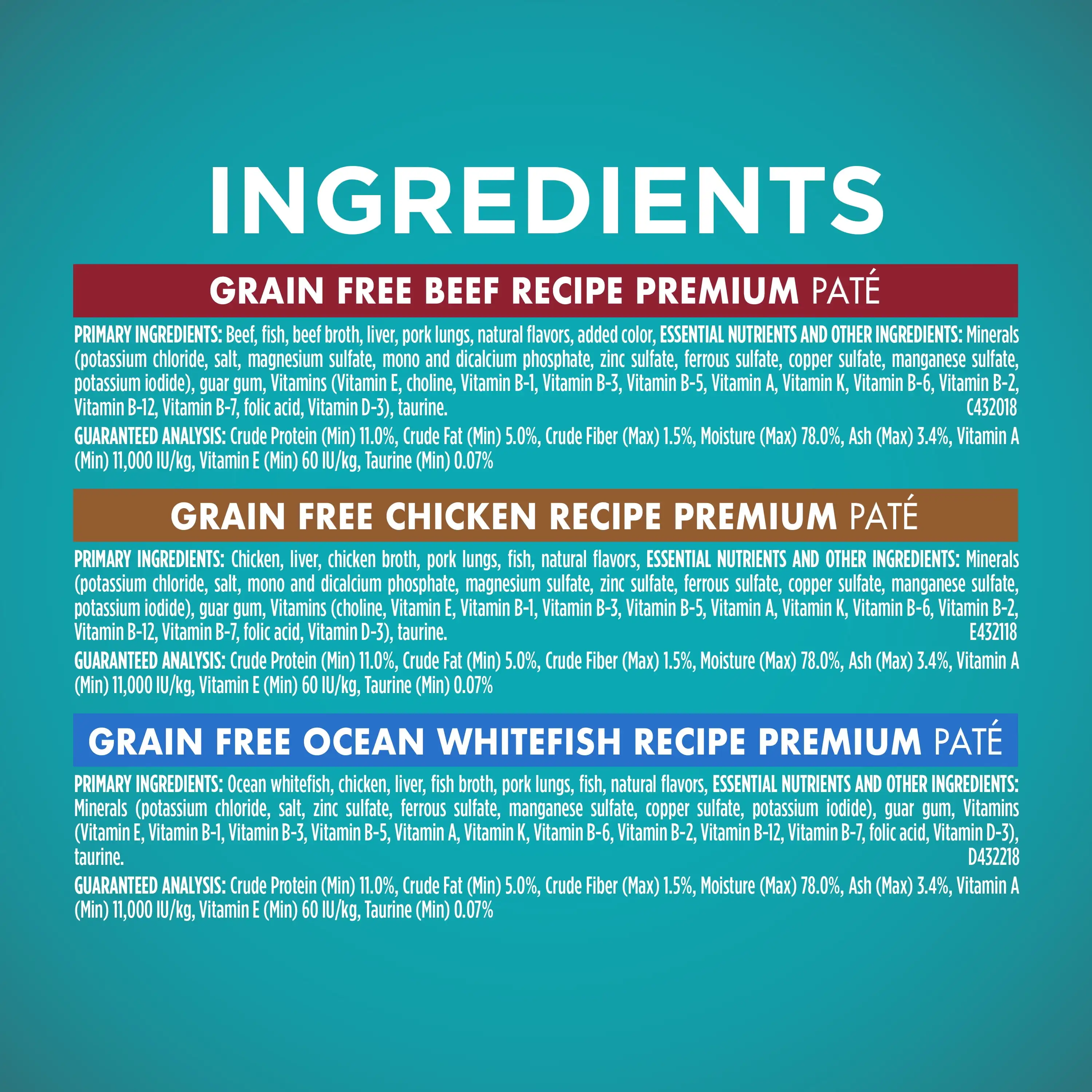 [‘purina one wet cat food variety pack, grain-free,3 oz cans (2 pack)nreal chicken, beef or ocean whitefish is the # 1 ingredient in each cann100% complete and balanced nutrition for all life stagesncontains three high-protein recipesnnatural with added vitamins, minerals and nutrientsnno fillers, so all ingredients have a purpose’]