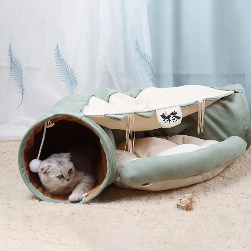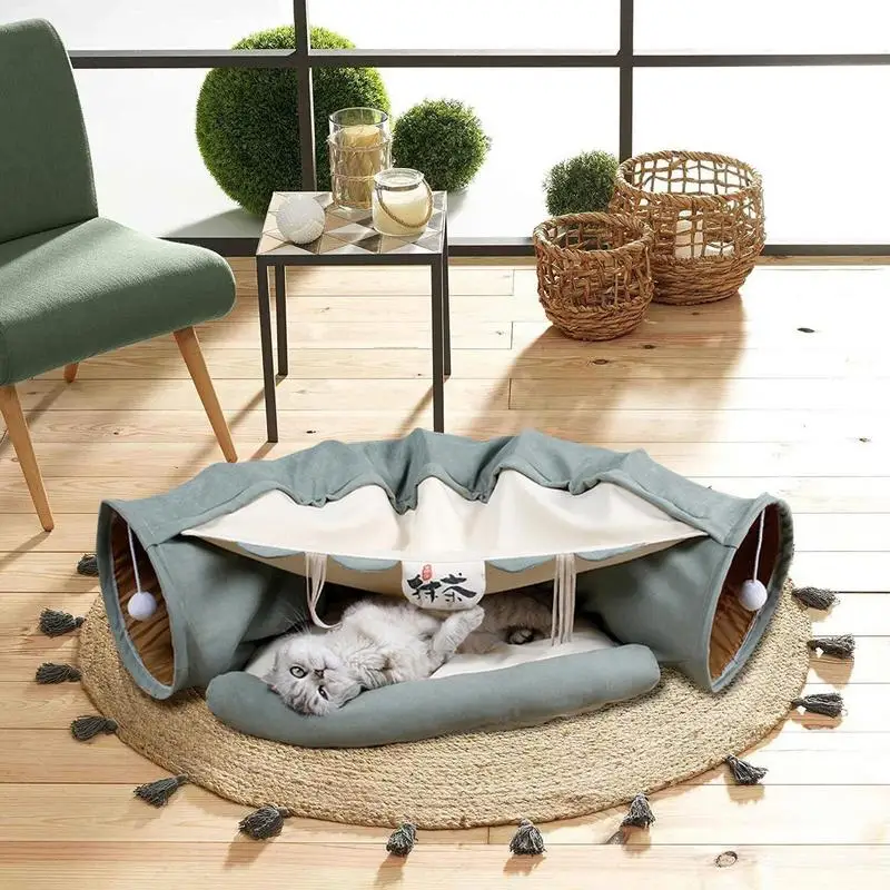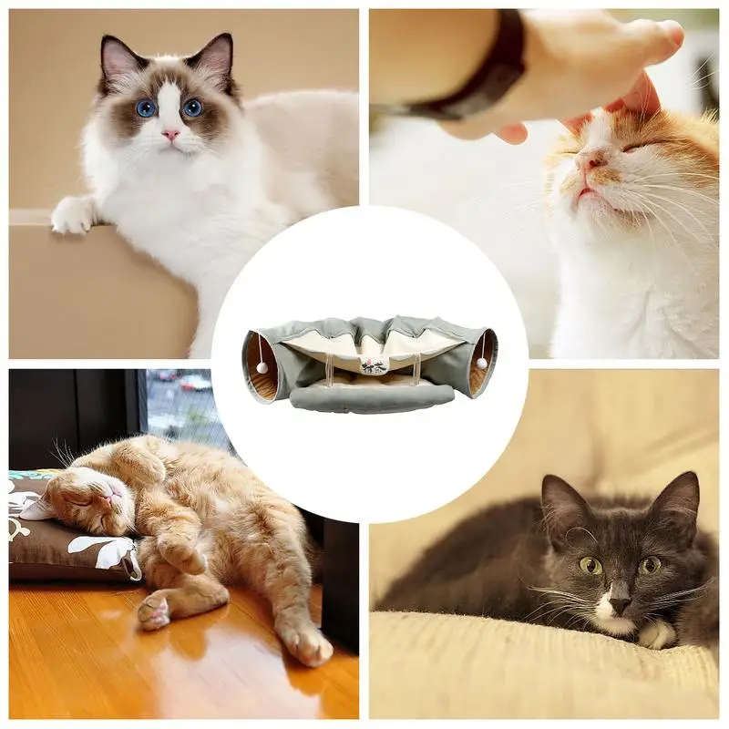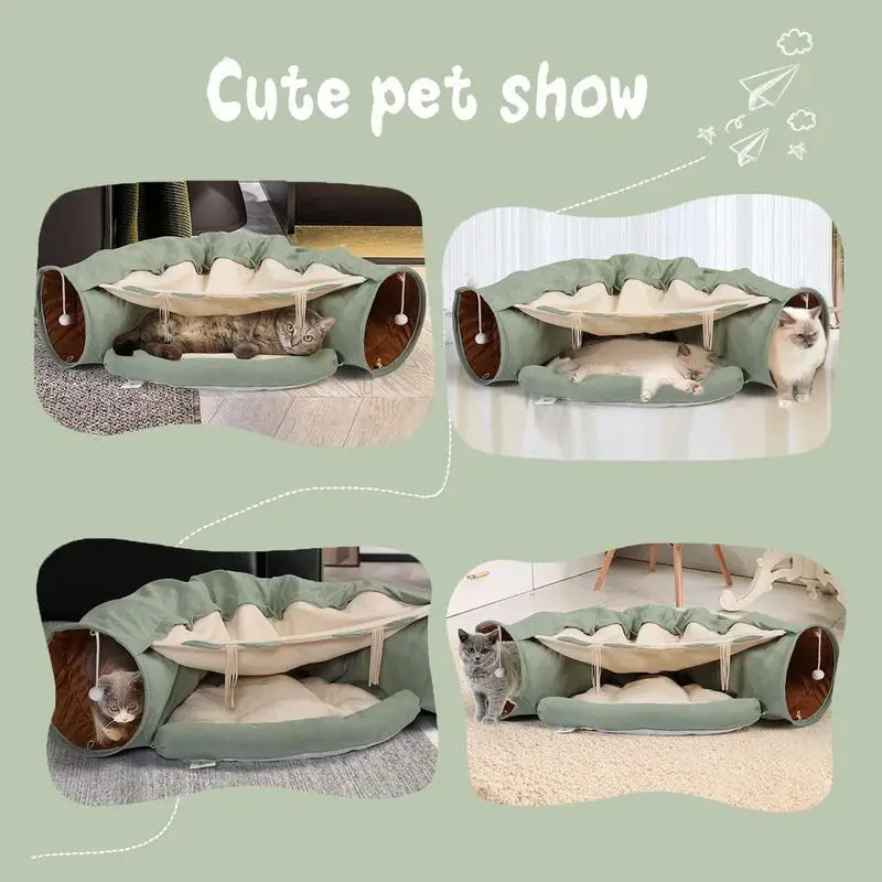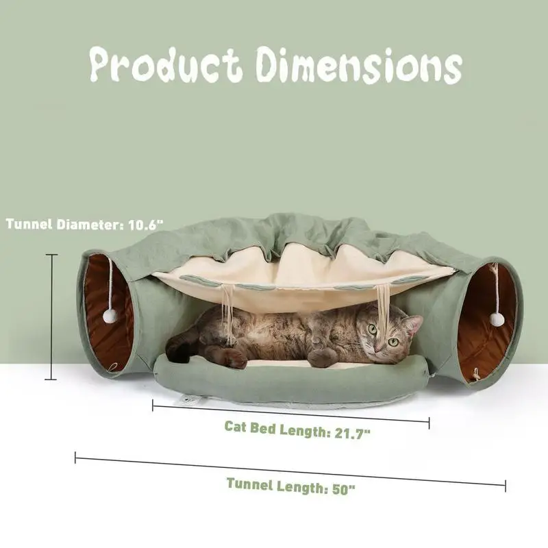 Bullet Points: 1.Multi-Purpose Design: Offering more entertainment and a cozy bed for relaxation, the cat tunnel bed is designed to serve as both a playful toy and a comfortable sleeping mark. Treat your furry friend to a versatile accessory that promotes their wellbeing 2.Fold and Portable: Take your cat’s cozy hideaway wherever you go. Fold and store our cat tunnel bed with ease, making it the perfect companion for travel or convenient storage at home 3.Long-Lasting Material: Manufactured using excellent quality materials, this cat tunnel bed is built to last. Your pet will enjoy a safe and comfortable space to play and sleep, ensured to withstand the test of time 4.Interactive Fun: Encourage cats to perform activities and promote physical exercise with this tunnel featuring suspended balls and hammocks, providing more entertainment 5.For Your Furry Friends: Suitable for small and medium-sized cats, kittens, rabbits, ferrets, and other small pets, this cat tunnel bed is perfect for multi-pet households. Its versatile design provides more entertainment to keep your furry friends happy Our multi-functional cat tunnels are perfect for indoor cats seeking exercise and entertainment. Made with endurable materials, these tunnels are suitable for small and medium-sized cats, kittens, rabbits, ferrets and other small pets. Conveniently foldable and portable.