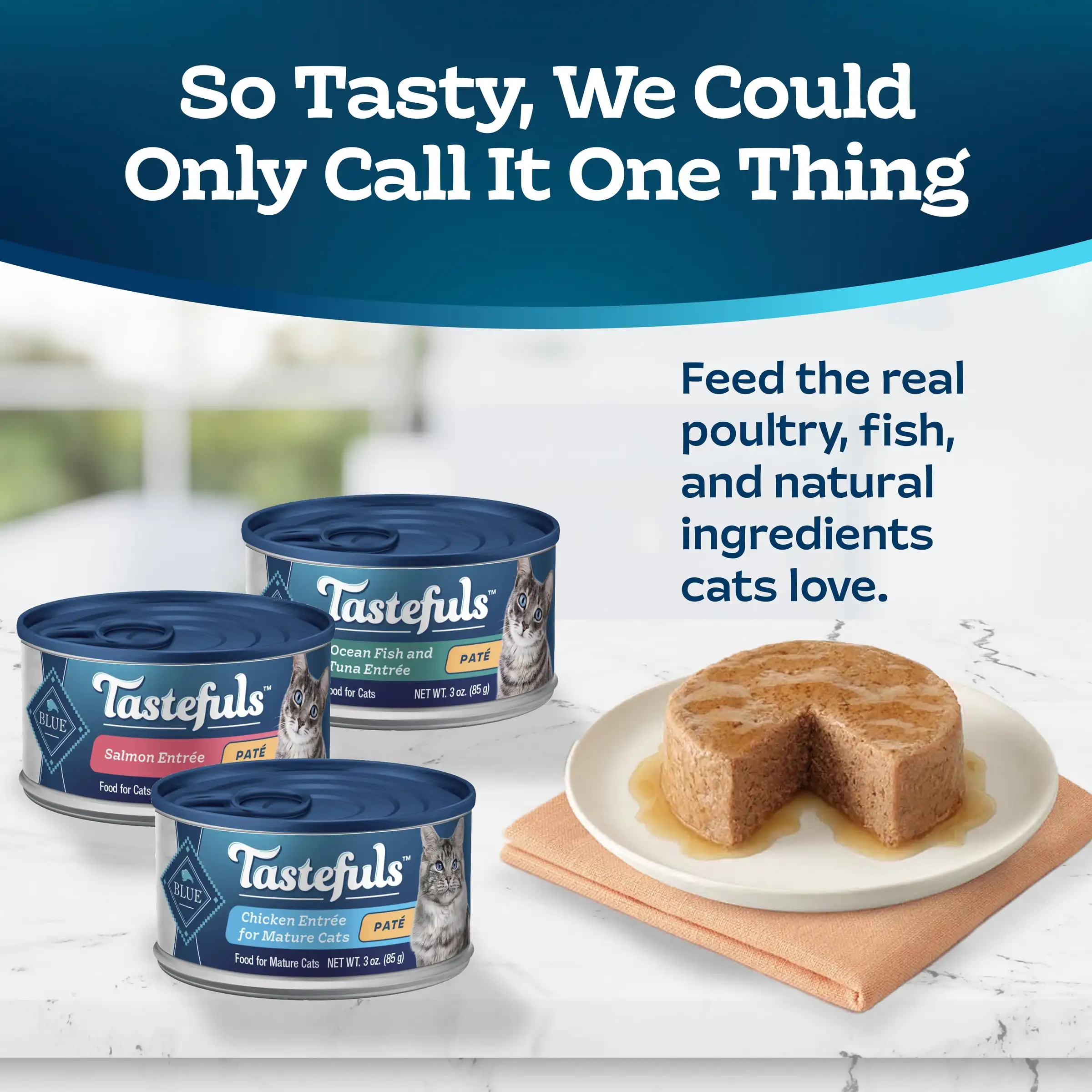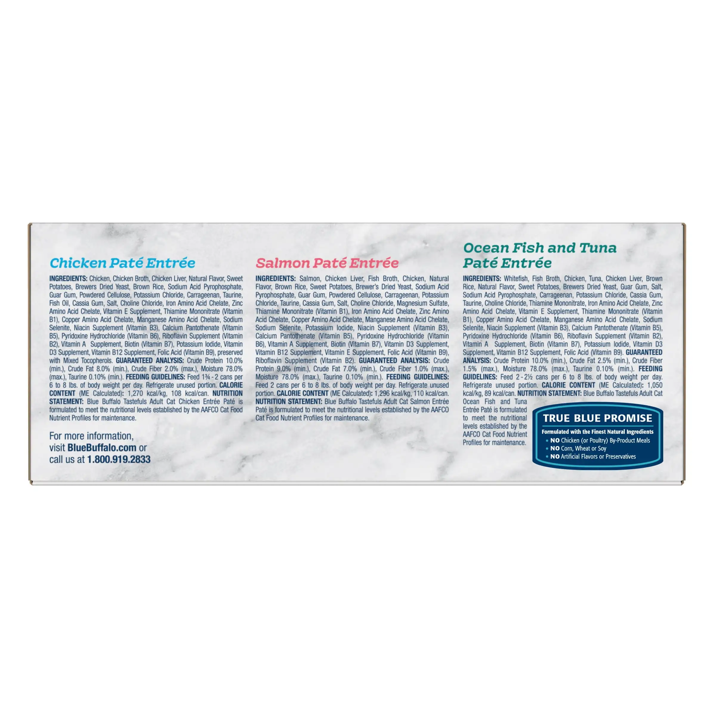 [“delicious Chicken, Salmon Or Whitefish First: The First Ingredient In This Blue Tastefuls Cat Food Variety Pack Is Protein-rich Chicken, Salmon Or Whitefish To Support Healthy Muscle Maintenancensavory Patés: Tastefuls Wet Cat Foods Featuring Smooth, Silky Textures Are So Flavorful Even Finicky Felines Will Come Back For More; One Taste Is All It Takesnwet Cat Food: Blue Canned Cat Food Have High Moisture Content, By Can Help Cats Get Their Daily Hydrationnnatural Canned Food: Enhanced With Vitamins, Minerals And Other Nutrients, Tastefuls Have No Chicken (or Poultry) By-product Meals, No Corn, Soy Or Wheat (a Common Thickening Agent Used By Many Other Brands) And No Artificial Flavors Or Preservativesncontains One (1) Variety Pack Of Blue Tastefuls Natural Pate Wet Cat Food, Salmon, Chicken, Ocean Fish & Tuna Entrées 3-oz Can (12 Count – 4 Of Each Flavor)nenhanced Imagery: We Have Enhanced Our Digital Product Packaging To Highlight Our Products’ Ingredients And Essential Benefits. While the physical packaging will vary slightly, all information is accurate.”]