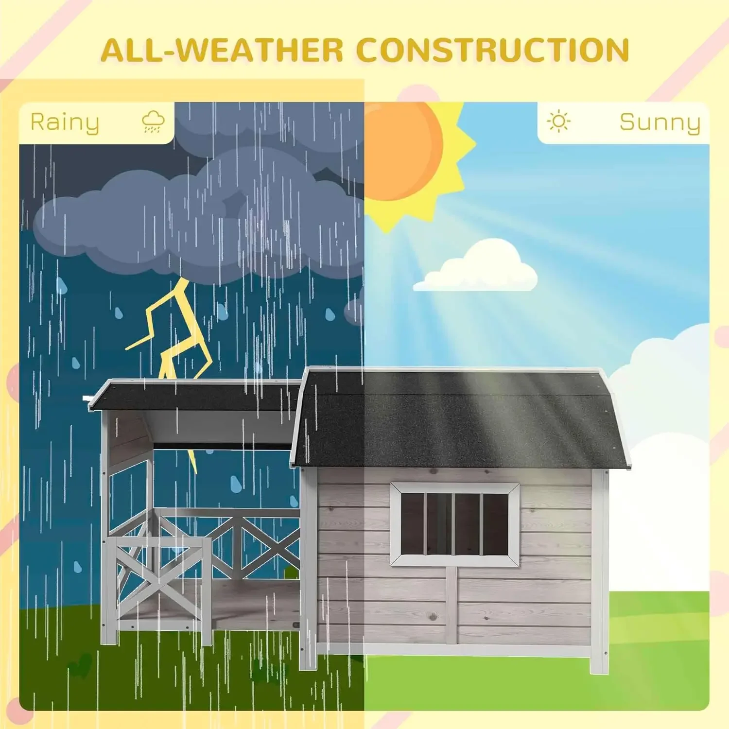 All-Weather: The main area of the house has an asphalt roof to withstand most light weather. The spacious deck of our outside dog house is great for your dog to lounge or nap on a sunny day.