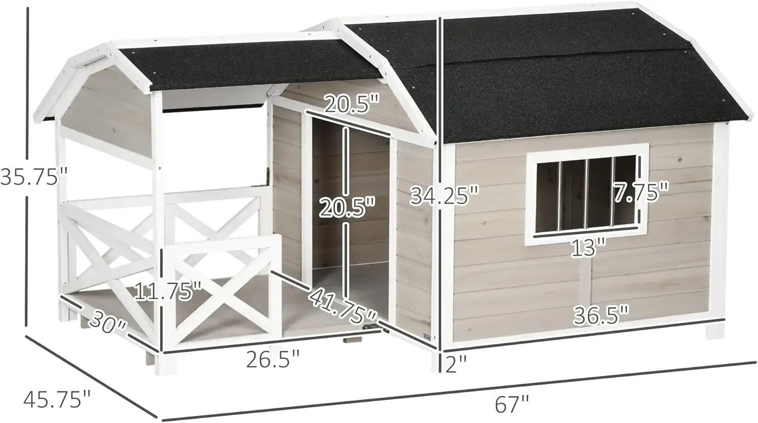 Pet House Info: Overall Dimensions: 67″ W x 45.75″ D x 35.75″ H. Main Living Room: 36.5″ W x 41.75″ D x 34.25″ H. Assembly required.