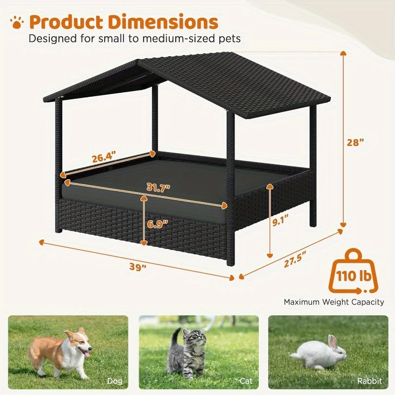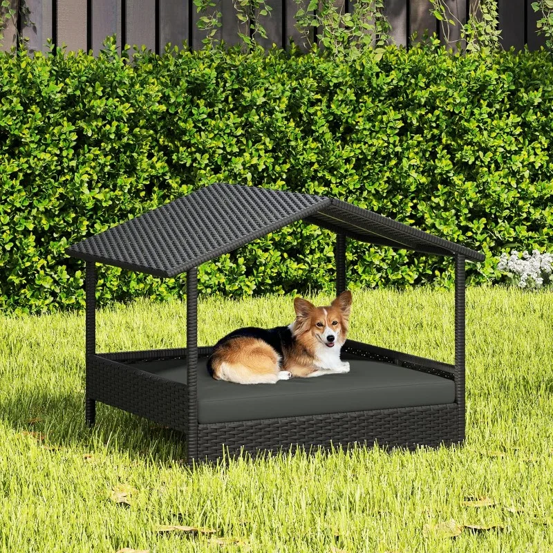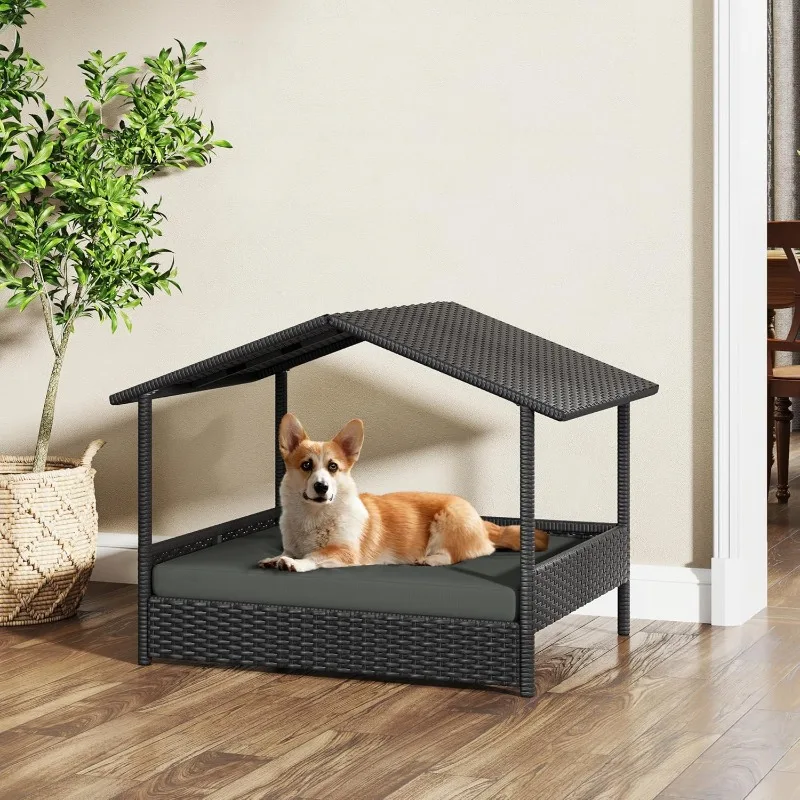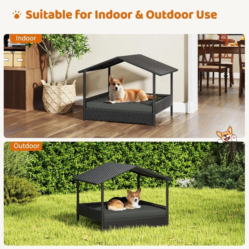 Yaheetech Wicker Dog House Outdoor Indoor with Canopy Elevated Dog Shelter Dog Bed with Cushion for Small Medium Dogs Shade for Deck Patio Yard Pool Black House Gray Cushion